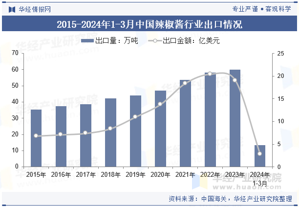 中国辣椒酱的出口目的地广泛,销往全球200多个国家和地区。出口市场不再局限于亚洲地区及邻近国家,还包括欧美市场。主要出口国家包括西班牙、美国、日本、马来西亚等。但是中国辣椒出口产品相对单一,主要集中于干辣椒,而辣椒酱、辣椒醋等深加工产品的开发和加工程度较低,中国辣椒产业在提升产品附加值和技术含量方面还有很大的提升空间。2024年1-3月中国辣椒酱行业出口量为13.31万吨,出口额为2.86亿美元。