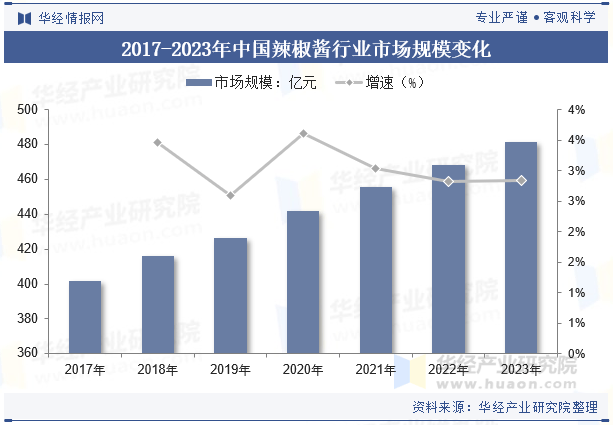 辣椒酱作为重要的调味品,在餐饮业中的应用十分广泛,尤其在一些特色菜肴中不可或缺龙8long8。家庭烹饪需求的增加也促进了辣椒酱市场的发展。随着人们对于健康饮食和家庭烹饪的重视,辣椒酱作为增添食物风味的调味品,其市场需求随之增长。辣椒酱作为中国饮食文化中的一部分,随着辣味食品的流行,辣椒酱的市场需求也随之增加。辣味食品在小吃、方便面、调味品等领域的广泛应用,进一步推动了辣椒酱市场的发展。2023年中国辣椒酱行业市场规模约为481.7亿元。2017-2023年CACR为2.62%。