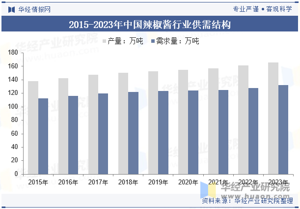 随着经济的发展和人民生活水平的提高,消费者对于调味品的需求不断增长,特别是对于具有特色的辣椒酱产品。这直接推动了辣椒酱市场的扩大。电商平台的发展,辣椒酱的销售渠道得到了极大的拓展。线上销售的便捷性吸引了更多的消费者,促进了辣椒酱销量的增长。2023年中国辣椒酱行业产量超过165万吨,需求量超过130万吨。